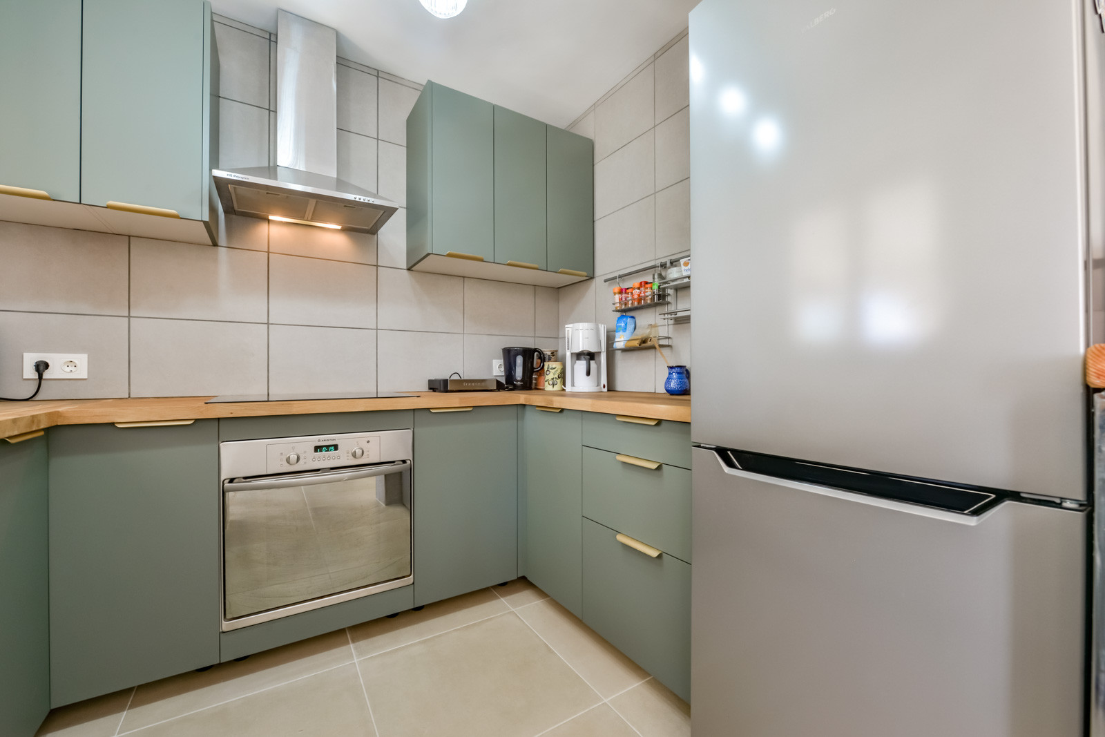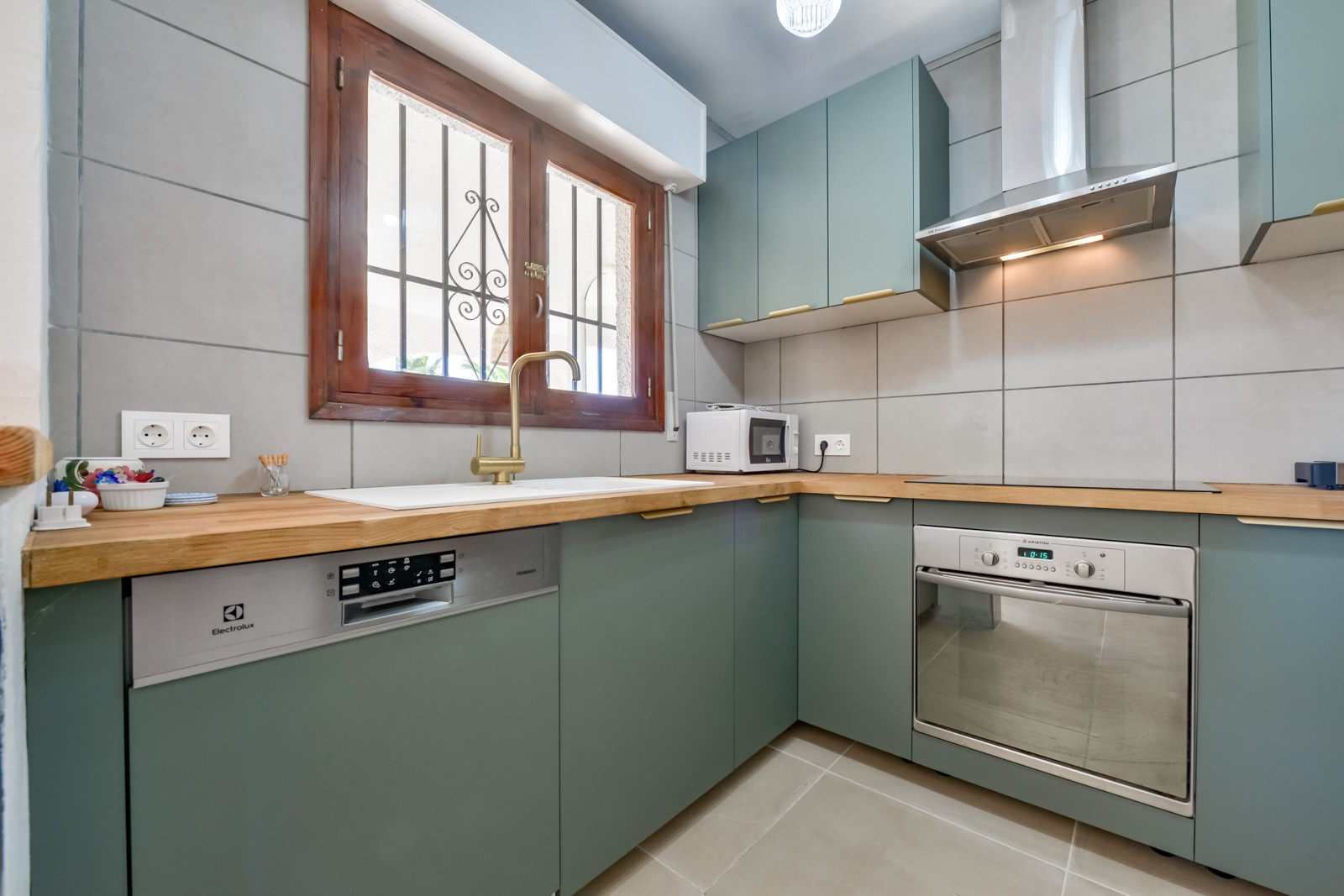 La cuisine américaine, à vitrocéramique, est équipée avec réfrigérateur, micro-ondes, four, congelateur, lave-linge, lave-vaisselle, vaisselle/couvert, ustensiles/cuisine, cafetière, grille pain et bouilloire.